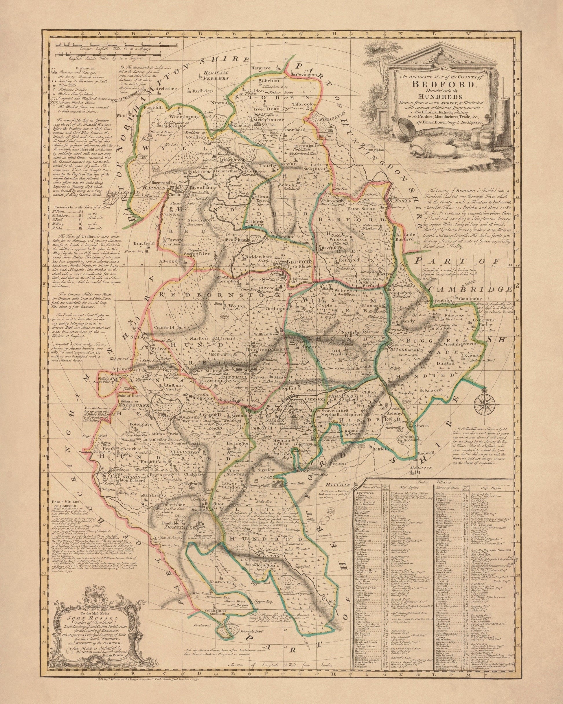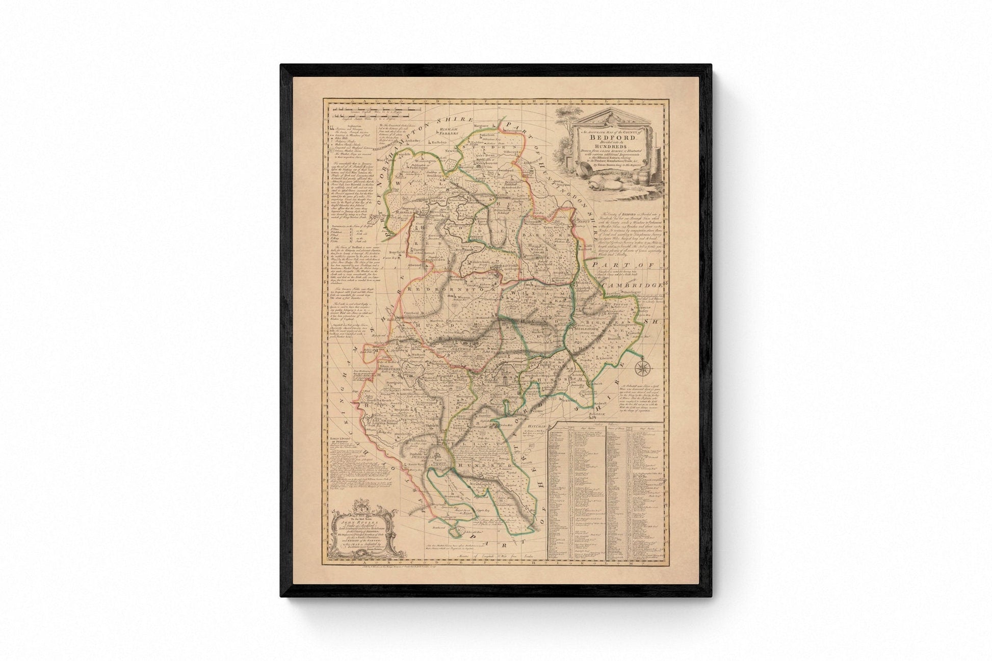 This antique-style map of Bedfordshire Map Dated 1749 is a high-quality reproduction of a Victorian engraving. Originally produced in the 1800s, it¡¯s ideal for those who appreciate historical cartography and vintage wall art.