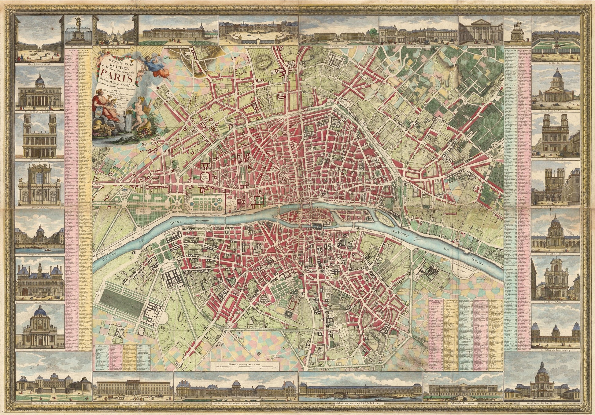 The map covers the city and its immediate environs.?Extensive tables identify streets, parishes, colleges, hospitals, major architectural edifices and other points of interest.?It is framed by a floral border with a title cartouche showing angels and an allegory of Paris, along with symbols of the arts and sciences. Around the map are 8 vignettes portraying landmarks and other places of importance.?