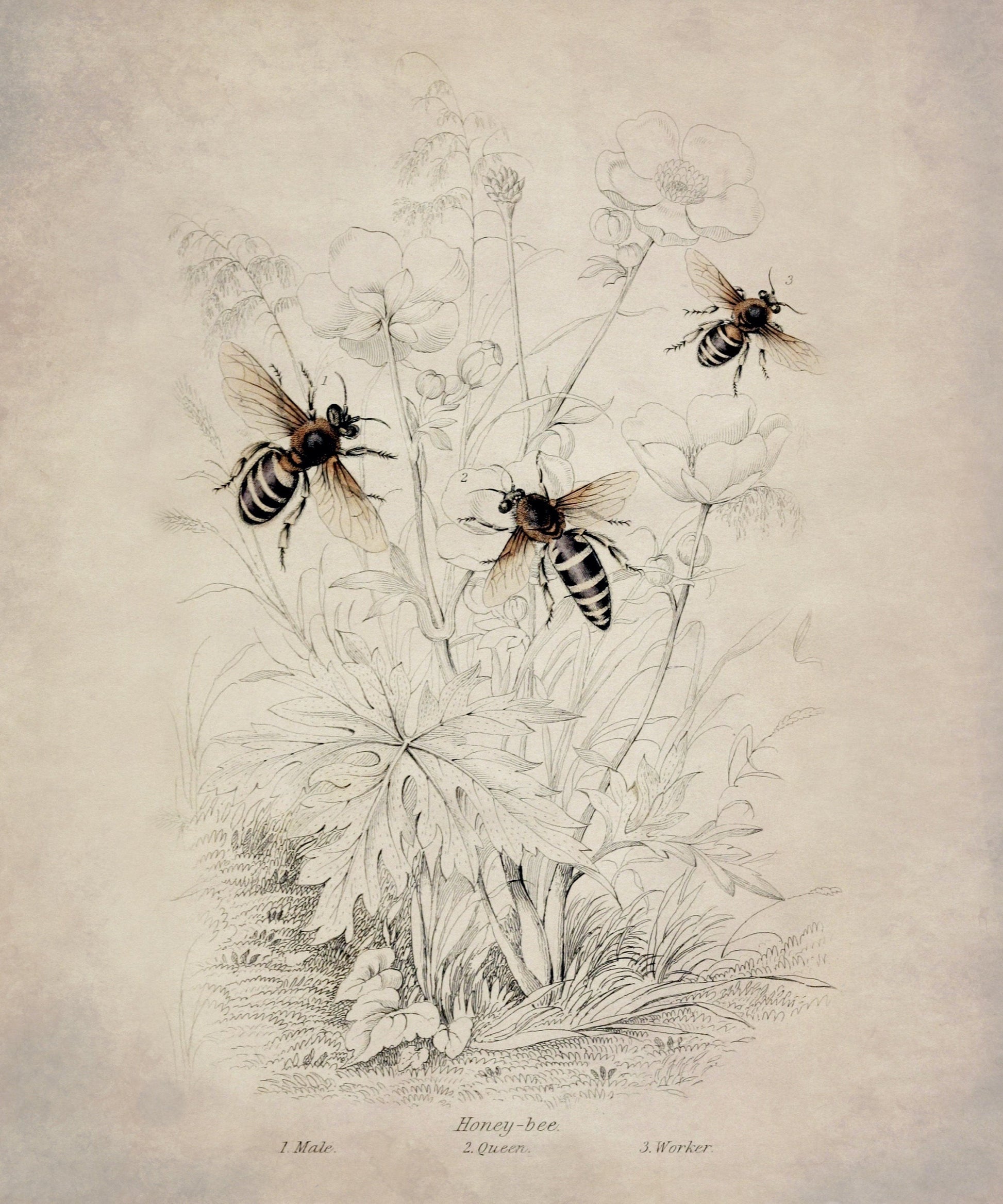 This vintage reproduction of Honeybee (Male, Queen And Worker) Print is a faithful representation of an original 19th-century engraving ¡ª perfect for classic interiors and collectors of antique-style wall art.