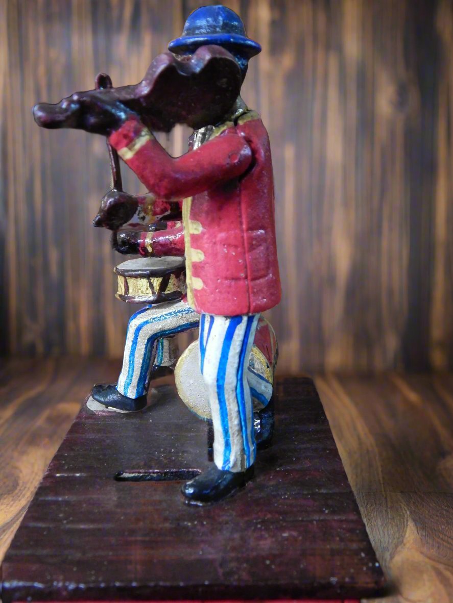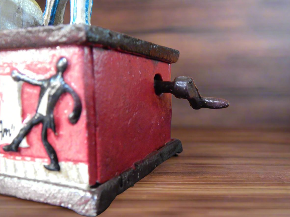 A wonderful reproduction of an American cast iron mechanical toy coin bank that showcases the skill ingenuity, craftsmanship of the late 1800s.