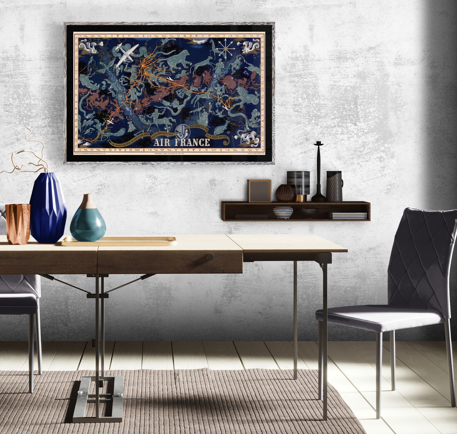 This is a fine print reproduction of a celestial themed air travel map by renowned mid-century French artist Lucien Boucher. The map was produced as part of a large series of promotional route maps for Air France in the late 1930s.?